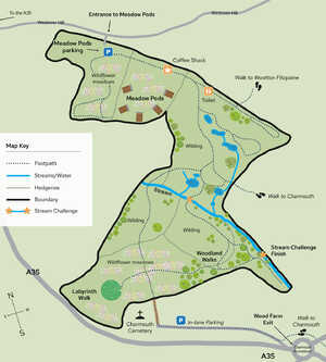 The labyrinth meadow provides a unique, contemplative experience. This beguiling walk winds to the heart of the meadow, offering tranquillity and breathtaking views of the Dorset countryside. Perfect for reflection, the labyrinth is a serene counterpart to the lively activities of the Stream Challenge.